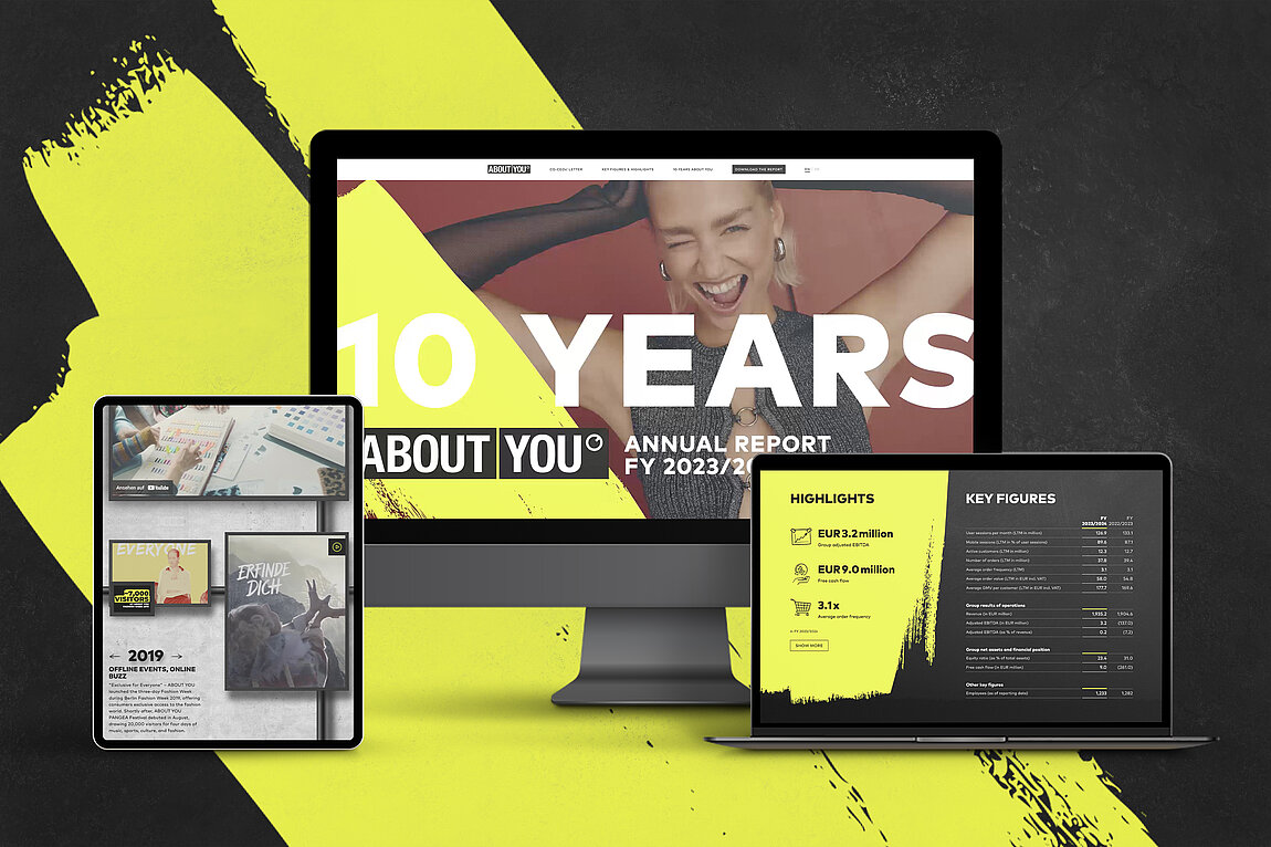 „Der Geburtstag – 10 JAHRE ABOUT YOU wird durch die Gestaltung und Animationen der Microsite direkt spürbar. Inhaltlich wird ein kurzer und prägnanter Überblick über das Geschäftsjahr geschaffen. Spannende Effekte und Funktionalitäten machen die Story erlebbar. Die übersichtliche Chronik schafft mit dem Einsatz von Bewegtbild einen transparenten Einblick in die Geschichte. Des Weiteren konnten wir den Erstellungsprozess gemeinsam mit unserem Kunden weiter straffen und das PDF des Berichts komplett in Workiva umsetzen.“